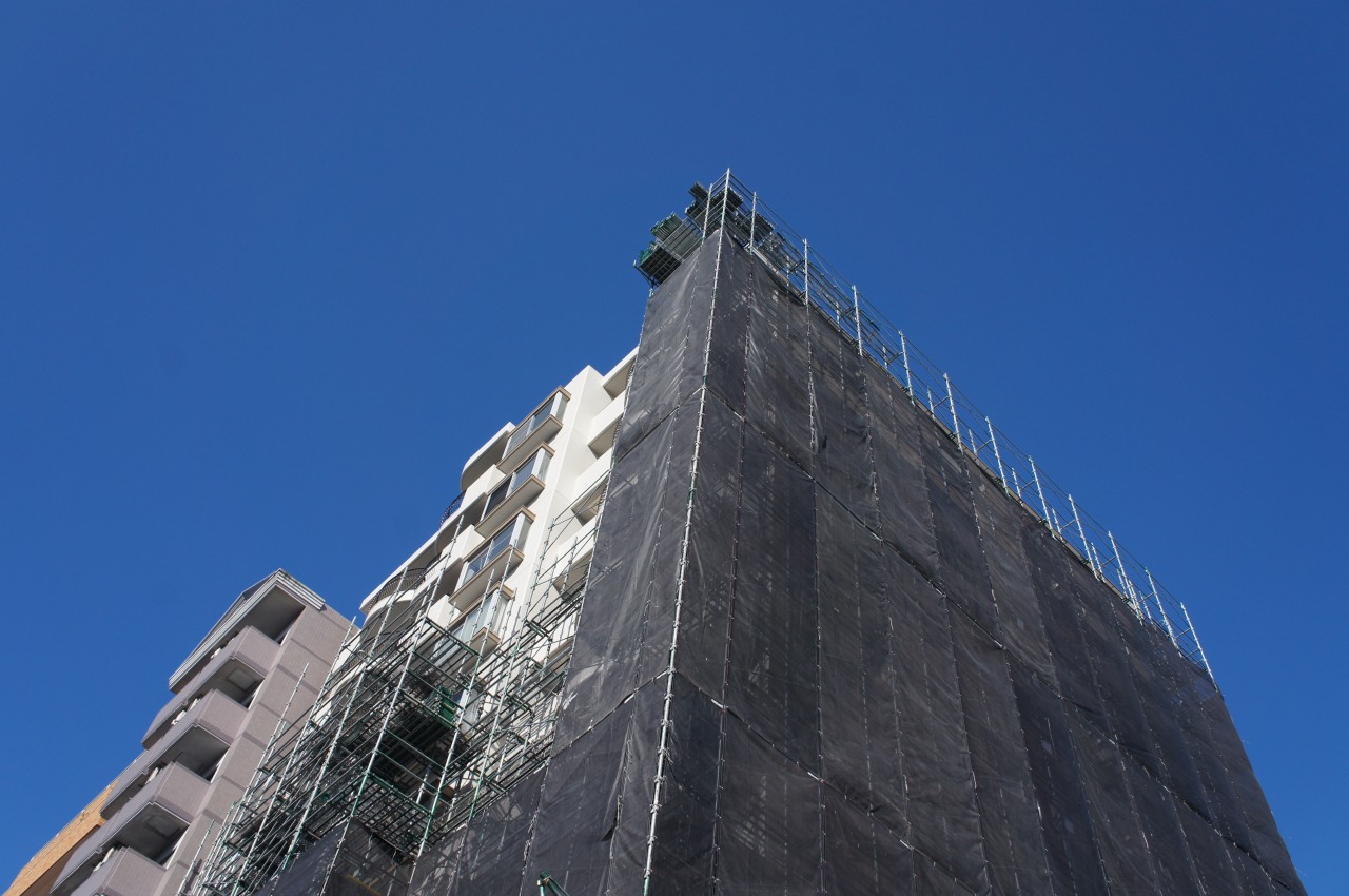 弊社ではマンション、ビル、商業施設などの比較的大規模な工事を中心に改修足場の施工を行っております。既に出来上がっている構造物に足場を組んでいく作業の為、建物を傷つけないよう、改修足場用のメッシュシートを使用して細心の注意で作業を行います。